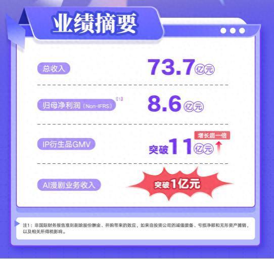 3月17日,阅文集团(股票代码:00772.HK)发布2025年全年财报。数据显示,2025年阅文实现营业收入73.7亿元,Non-IFRS归母净利润8.6亿元。在“IP+AI”战略指引下,阅文的AI漫剧、短剧、IP衍生品等新业态实现多元突破,其中AI漫剧收入呈爆发式增长,突破亿元大关;IP衍生品GMV同比增长超一倍,突破11亿元。