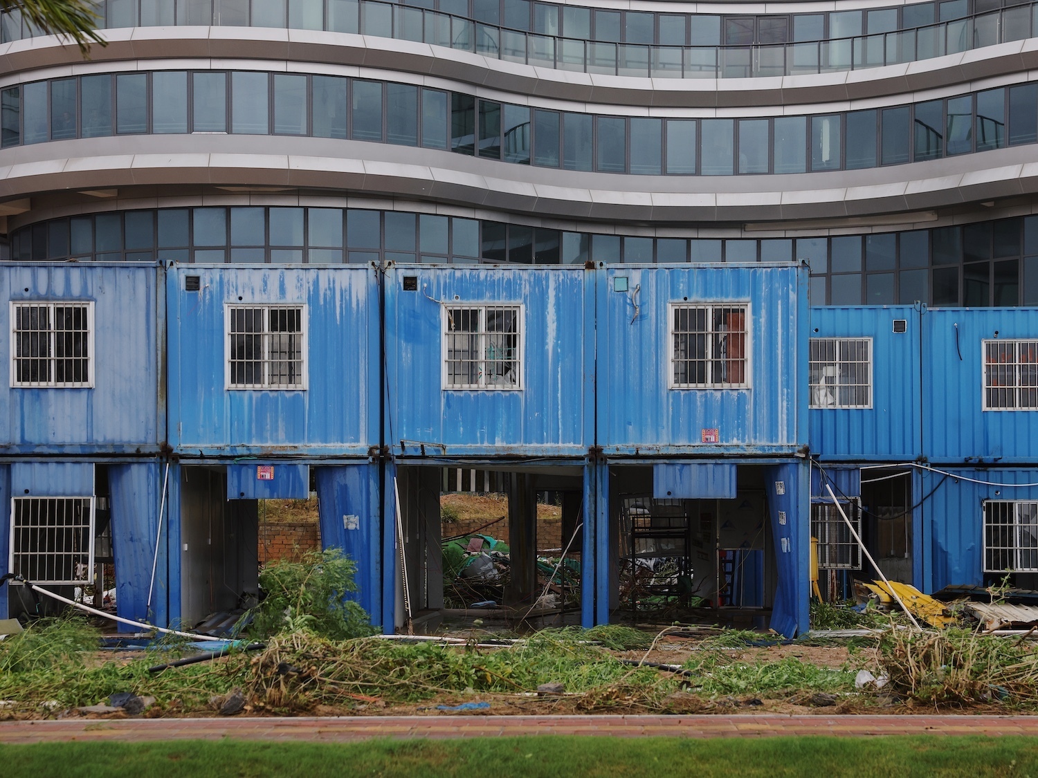 珠海,被台风“桦加沙”吹坏的工地集装箱,工地工人在台风前已撤离。